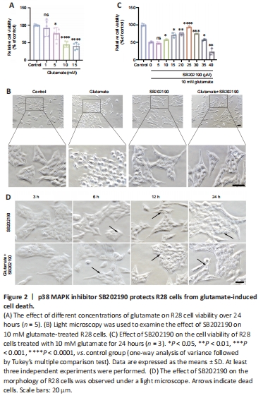 The R28 cell line has been widely used to explore the neuroprotection and pathological mechanism of RGCs in vitro in several studies (Dai et al., 2022; Liu et al., 2022; Yao et al., 2023). To explore the effects of SB202190 on glutamatergic toxicity, we used R28 cells as an in vitro model. We cultured R28 cells for 24 hours with various concentrations of glutamine and found that cell viability was approximately 50% in the presence of 10 mM glutamate (Figure 2A). Therefore, we chose 10 mM for subsequent experiments.