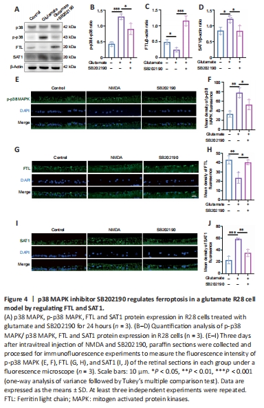 To further explore the mechanism of SB202190 on glutamate-induced ferroptosis, we examined the expression of ferroptosis-related proteins. Western blot showed that FTL expression decreased and SAT1 expression increased in glutamate-treated R28 cells compared with controls (P < 0.05; Figure 4A, C, and D). SB202190 co-treatment reversed the effects of glutamate on the expression of these two proteins (P < 0.05). We also performed qRT-PCR to measure the mRNA levels of FTL and SAT1 (Additional Figure 1). While the mRNA level of FTL was unchanged by glutamate treatment, FTL mRNA increased with SB202190 co-treatment (P < 0.05); the mRNA level of SAT1 increased with glutamate treatment and decreased with SB202190 co-treatment (P < 0.05). Fluorescence microscopy of paraffin sections from animal models revealed that the trend of FTL and SAT1 fluorescence intensity changes was compatible with the results of cell experiments (Figure 4G–J). FTL expression was decreased and SAT1 expression increased in the NMDA group compared with the control group. Addition of SB202190 prevented the changes induced by NMDA.