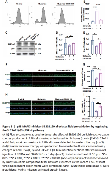 We examined intracellular ROS content after drug treatment of R28 cells (Figure 5A and B). Glutamate increased ROS relative to the control group (P < 0.0001), and the mean fluorescence intensity (MFI) value of ROS in glutamate group was approximately 5.13-fold of that in control group. However, the MFI significantly decreased with co-treatment of SB202190 compared with glutamate alone (P < 0.0001). The SLC7A11/GSH/GPX-4 axis is the main intracellular antioxidant system that protects against ferroptosis and regulates lipid reactive oxygen species production (Jiang et al., 2021). Our results showed SB202190 co-treatment did not impact glutamate-induced GSH changes in R28 cells (Figure 3I). We also examined SLC7A11 and GPX-4 protein expression in R28 cells (Figure 5C–E). SLC7A11 protein showed no significant changes between the glutamate and control groups (P > 0.05). However, SLC7A11 increased after SB202190 co-treatment compared with glutamate alone (P < 0.05). GPX-4 expression was lower in the glutamate group than in the control group (P < 0.05) and it increased with co-treatment of SB202190 (P < 0.05). We used qRT-PCR to detect the mRNA levels of SLC7A11 and GPX-4 (Additional Figure 1). Both SLC7A11 and GPX-4 mRNA levels showed a significant increase upon SB202190 co-treatment compared with glutamate alone (P < 0.05). Immunofluorescence analysis of paraffin sections of animal models showed that the trend of SLC7A11 and GPX-4 expression changes were compatible with the results in R28 cells (Figure 5F–I).
