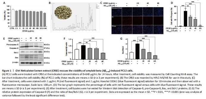 Figure 1|Citri Reticulatae Semen extract (CRSE) rescues the viability of amyloid-beta (Aβ1–42)-induced PC12 cells.