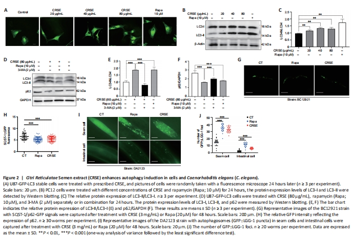 Figure 2|Citri Reticulatae Semen extract (CRSE) enhances autophagy induction in cells and Caenorhabditis elegans (C. elegans).