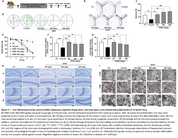 Figure 6|Citri Reticulatae Semen extract (CRSE) attenuates cognitive impairment, neuronal injury, and amyloid-beta (Aβ) burden in 3×Tg-AD mice.