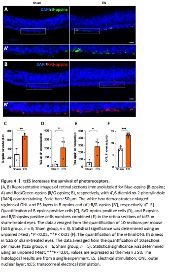 We counted photoreceptor cells in retinal sections to determine if tcES improves retinal and visual functions by preserving photoreceptors. Immunostaining revealed that tcES ameliorated the loss of B-opsins (Figure 4A) and Red/Green-opsins cells (Figure 4B). Quantitative analysis of B-opsins positive cells (P < 0.01; Figure 4C); Red/Green-opsins positive cells (P < 0.05; Figure 4D) and total opsin positive cells numbers (P < 0.05; Figure 4E) demonstrated significantly improved survival of B-opsin, R/G-opsin, and total Opsin-positive cells in the tcES group compared to sham-treated contralateral eyes). ONL thickness was also significantly increased (P < 0.001) in tcES-treated retinas compared to sham-treated eyes. This indicates improved survival of all types of photoreceptor cells after tcES treatment (Figure 4F). These results indicate tcES ameliorated photoreceptor loss in Rho–/– mice retina.