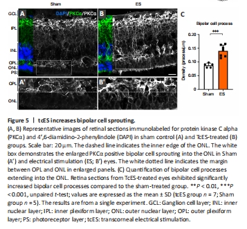 Bipolar cells have been shown to undergo structural changes and neurite sprouting that contribute to retinal function and recovery (Lewis et al., 1998). To evaluate if tcES affected bipolar cell plasticity, we performed immunolabeling for the bipolar cell-specific marker Protein kinase Cα (PKCα). We observed prominent upregulation of PKCα immunolabeling in the tcES-treated retina, primarily associated with bipolar cell processes, compared to the sham-treated retina (Figure 5A and B). We also noted an increase in bipolar cell processes that grew into the ONL. Quantitative analysis of the density of the bipolar cell dendrite extending into the ONL confirmed that tcES significantly increased the density of bipolar cell sprouting (P < 0.001) into the ONL compared to the sham-treated group (Figure 5C). Increased retinal plasticity and bipolar cell sprouting in response to the tcES may be an additional mechanism contributing to increased photoreceptor survival and function in the Rho–/– mice.