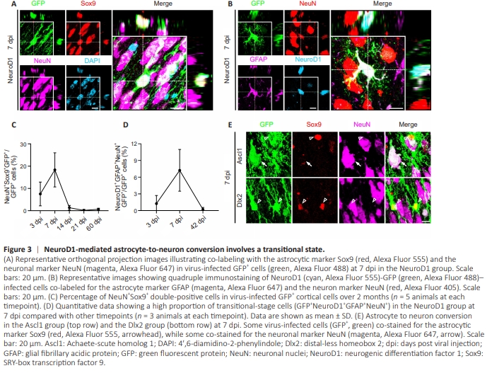 Intriguingly, at 7 dpi after infection, some NeuroD1-GFP– overexpressing cells expressed both Sox9 and NeuN, suggesting a transitional stage between astrocytes and neurons (Figure 3A). Similarly, some NeuroD1-GFP– overexpressing cells expressed both the astrocytic marker GFAP and the neuronal marker NeuN at 7 dpi (Figure 3B). Quantitative analysis showed that this transitional cell population was mainly present during the early stage of conversion, especially at 7 dpi, and was not observed during the late stage of conversion (Figure 3C and D), suggesting that these transitional cells represent a unique intermediate stage during NeuroD1-mediated AtN conversion. Interestingly, such transitional cells were rarely found among Ascl1- overexpressing cells or Dlx2-overexpressing cells (Figure 3E), suggesting that during AtN conversion, different NTFs regulate different genes related to astrocytic and neuronal functions.