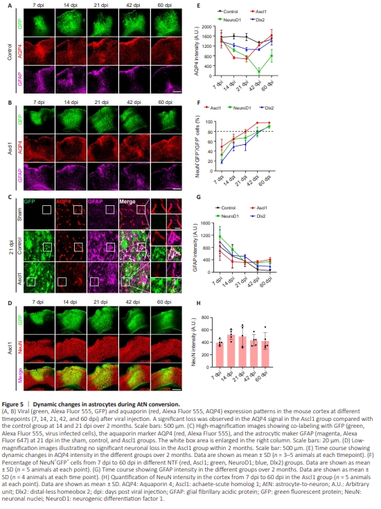 The results described above suggest that cortical astrocytes are gradually converted into neurons after being infected with AAVs expressing the NTFs NeuroD1, Ascl1, and Dlx2. If the AtN conversion does occur, then astrocytic properties should significantly change during the conversion process. Therefore, we examined the expression of a series of astrocytic markers during conversion. Interestingly, we observed a remarkable loss in the AQP4 signal in NTF-infected areas. AQP4 is a water channel that is mainly expressed at the astrocytic endfeet that wrap around blood vessels in a resting state (Nico etal., 2001; Nagelhus and Ottersen, 2013). In the control virus AAV9 GFAP104::GFP group, strong AQP4 signal was detected from 7 dpi to 60 dpi (Figure 5A, red signal). However, cells overexpressing Ascl1-GFP exhibited a significant drop in AQP4 expression at 14 and 21 dpi (Figure 5B, black areas among the red signal). The enlarged images shown in Figure 5C more vividly illustrate the decrease (but not absent) in the AQP4 signal (red) in the Ascl1-GFP–overexpressing areas, where most GFP-labeled cells exhibited neuronal morphology (Figure 5C). Interestingly, while the AQP4 signal decreased in the Ascl1- GFP–overexpressing areas, many GFAP+ astrocytes (magenta) were observed in the same areas (Figure 5C), suggesting that the decrease in the AQP4 signal was not due to depletion of astrocytes. We next asked whether such a dramatic decrease in the AQP4 signal in the Ascl1-overexpressing areas would have a negative impact on the local neurons. Surprisingly, there was no significant difference in NeuN staining between brain areas overexpressing GFP and those overexpressing Ascl1-GFP(Figure 5D and H). A similar decrease in the AQP4 signal was observed in the NeuroD1-GFP–converted (Additional Figure 1A and C) and Dlx2-GFP–converted (Additional Figure 1B, and C) areas. Quantitative analysis of AQP4 intensity showed that, while all three NTFs triggered a decrease in AQP4 signal during AtN conversion, the time course of the decrease in AQP4 signal intensity was quite different among the three factors, dropping most rapidly in cells overexpressing Ascl1 and most slowly in cells overexpressing Dlx2 (Figure 5E). This correlated with the observed conversion rates, as Ascl1- overexpressing cells exhibited the highest conversion rate, and Dlx2 the lowest (Figure 5F). GFAP intensity decreased continuously from 7 dpi to 60 dpi in all groups, including the control group (Figure 5G), reflecting the close association of GFAP expression with injury level. No significant changes in microglia numbers were observed in the NTF-overexpressing areas during the AtN conversion process (Additional Figure 2). The significant decrease in the AQP4 signal during NTFinduced AtN conversion indicates a dramatic change in astrocytic properties during this process.