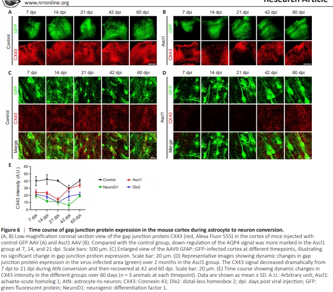 One distinct feature of astrocytes is that they are connected by gap junctions to form a web-like structure (Rash et al., 1997; Bennett et al., 2003). Therefore, we next examined astrocytic gap junctions during NTF-induced AtN conversion. AQP4 distribution within the brain shows striking similarities to the distribution of the gap junction marker connexin-43 (CX43) (Nagy et al., 1997). Similar to the decrease of AQP4 signal, there was a significant drop in the CX43 signal in the Ascl1-overexpressing areas at 14 and 21 dpi (Figure 6B), compared with the GFP control group (Figure 6A). Enlarged images showed that the CX43 signal was diffusely distributed throughout areas infected with the control (GFP) virus from 7 dpi to 60 dpi (Figure 6C, red signal); whereas in the Ascl1-GFP–overexpressing areas, the CX43 signal decreased dramatically from 7 dpi to 21 dpi and then recovered at 42 dpi and 60 dpi (Figure 6D). Similarly, both NeuroD1 and Dlx2 triggered a significant decrease in the CX43 signal in the NTFoverexpressing areas (Additional Figure 3). Quantitative analysis showed a universal decrease in the CX43 signal during NTF-induced AtN conversion (Figure 6E), followed by recovery of the CX43 signal during the late stage of AtN conversion. These results demonstrate that significant changes occurred in the astrocytic gap junctions during AtN conversion.