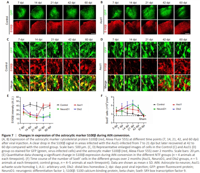 In addition to AQP4 and CX43, we also observed a significant drop in expression of the astrocytic marker S100β during AtNconversion. Compared with the GFP control group (Figure 7A), in which there was no significant change in S100β expression throughout the duration of the experiment, we observed a significant drop in the S100β signal in Ascl1– overexpressing areas from 7 to 21 dpi that recovered at 42 to 60 dpi (Figure 7B). The enlarged images shown in Figure 7C and D more clearly illustrate this decrease in S100β expression in the Ascl1-overexpressing areas, followed by recovery of S100β expression. A similar drop in S100β signal was also observed in NeuroD1– and Dlx2– overexpressing areas (Additional Figure 4). Quantitatively, the areas overexpressing Ascl1 showed the most rapid recovery in S100β signal (Figure 7E). To determine whether this decrease in the S100β signal reflected a decrease in the total number of astrocytes, we analyzed the expression of another astrocytic marker, Sox9. The total number of Sox9+ cells increased during the early phase of conversion and later dropped (Figure 7F), but remained higher than that in uninjured areas of the brain (dashed line in Figure 7F). Together, these results suggest that astrocytic properties are drastically changed by NTF overexpression.