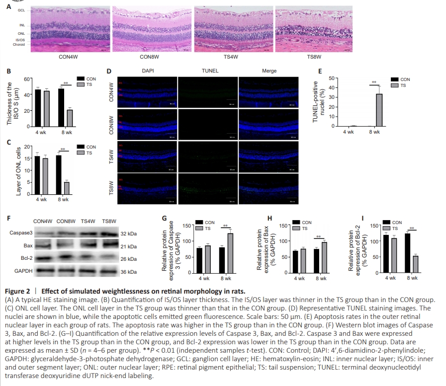 To determine whether simulated weightlessness can cause retinal damage, HE and TUNEL staining were performed to assess alterations in retinal structure and detect apoptosis, respectively. HE staining showed that, compared with the CON group, the IS/OS thickness (indicating optic cone and rod cell numbers) and the outer nuclear layer thickness were lower in the TS8W group (P < 0.05; Figure 2A–C). Furthermore, TUNEL staining showed a significant number of apoptotic cells in the outer nuclear layer after 8 weeks of tail suspension (P < 0.01; Figure 2D and E). Consistent with these findings, higher expression levels of the proapoptotic molecules Bax and Caspase 3 were detected in the TS8W group than in the CON group (Figure 2F–I). This suggests that tail suspension simulation of weightlessness can lead to degenerative changes in apoptosis of the outer nuclear layer cells of the rat retina.