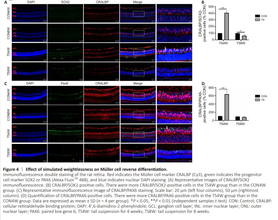 To determine whether simulated weightlessness stimulates retrodifferentiation of Müller cells, the retinas were double stained for CRALBP (a marker of Müller glial cells (Jurkute and Robson, 2021)) and SOX2 or PAX6 (stem/progenitor cell markers (Lin et al., 2009)). As shown in Figure 4A–D, following 4 weeks of tail suspension, the rats exhibited massive activation of retinal Müller cells and a statistical increase in SOX2 and PAX6 expression compared with the CON group (P < 0.01; Figure 4B and D). Following 8 weeks of tail suspension, a notable reduction was observed in the expression levels of SOX2 and PAX6, with SOX2 expression more greatly reduced (P < 0.05; Figure 4B). This suggests that tail suspension in rats effectively simulates weightlessness and stimulates retrodifferentiation of retinal Müller cells, which exhibit progenitor cell properties for a short period of time.