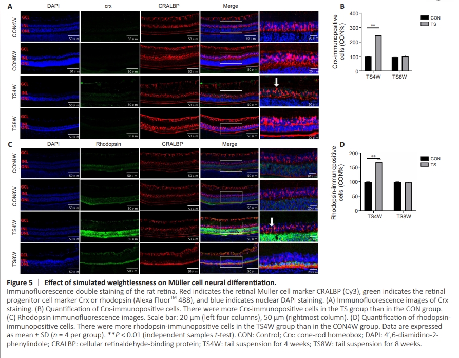 To determine whether simulated weightlessness stimulates Müller cell neurodifferentiation, we performedimmunofluorescence staining for crx and rhodopsin. Based on the results of proteomic analysis, we found that the expression of rhodopsin in the retina tissue of TS8W group rats decreased (Additional Table 1). Next, retinas were double stained for CRALBP and the photoprecursor/mature photoreceptor cell markers crx and rhodopsin. As shown in Figure 5, crx and rhodopsin expression levels were higher in the retinal tissues of rats in the TS4W group compared with the CON group (P < 0.01). This suggests that tail suspension simulates the early stage of weightlessness and promotes Müller cell neurodifferentiation.