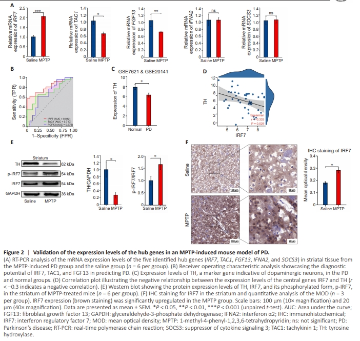 Next, we performed a preliminary literature review and chose to further investigate 5 of the 10 hub genes identified that have been less frequently mentioned or studied in the context of PD, specifically: TAC1, IRF7, FGF13, SOCS3, and IFNA2. We assessed the mRNA levels of these genes in PD mouse striatal tissue. Notably, IRF7 was expressed at significantly higher levels in the MPTP group than in the saline group. Furthermore, both TAC1 and FGF13 expression levels were notably reduced in the MPTP group compared with levels in the saline group. Conversely, SOCS3 and IFNA2 expression levels did not differ significantly between the MPTP and saline groups (Figure 2A). To evaluate the potential utility of IRF7, TAC1, and FGF13 as diagnostics markers for PD, we conducted an ROC analysis. The areas under the curve for IRF7 0.812, suggesting that would be highly accurate in predicting PD (Figure 2B). Expression levels of the marker gene TH, which is indicative of dopaminergic neurons (Hornykiewicz, 1998), were negatively correlated with IRF7 expression levels, as depicted in Figure 2D. This is consistent with the decreased TH expression observed in both patients with PD (Figure 2C) and mice with MPTP-induced PD (Figure 2E), suggesting irreversible damage to dopaminergic neurons. Further analysis by western blot showed significant upregulation of p-IRF7/IRF7 in the MPTPinduced PD mouse model (Figure 2E), suggesting that IRF7 may be actively involved in PD-associated inflammation. Additionally, immunohistochemical staining of the striatum showed a pronounced increase in the IRF7-positive area in the MPTP group compared with that in the saline group (Figure 2F).