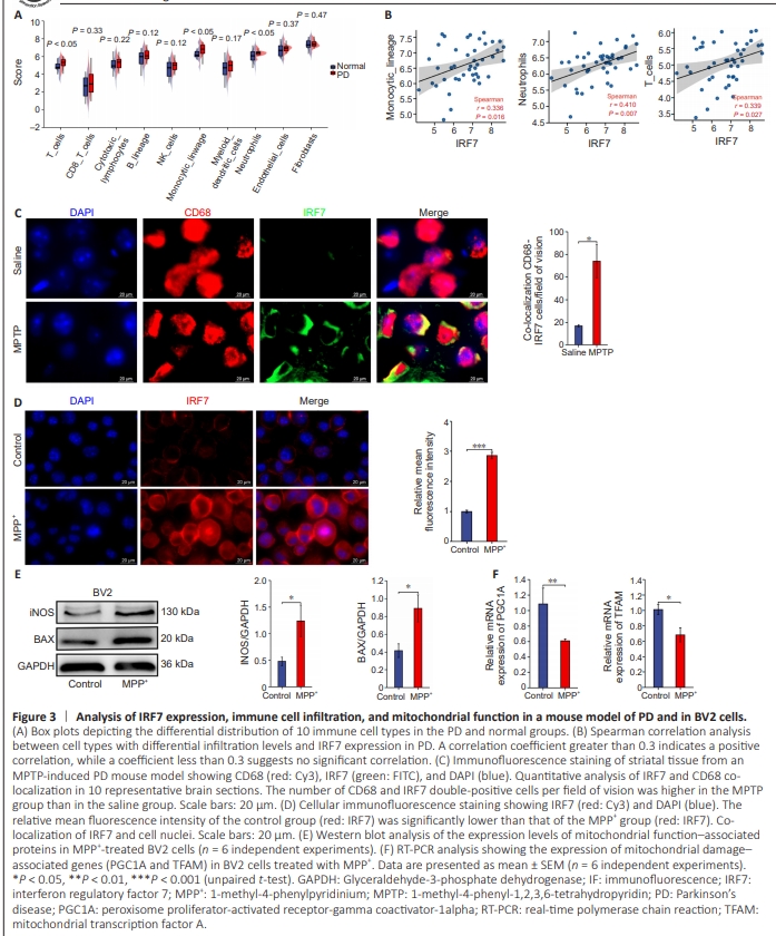 Next, we used the Microenvironment Cell Populations counter algorithm to analyze the immune activity of 10 types of immune cells in the PD and normal groups (Figure 3A). We observed notable differences in the numbers of infiltrating T cells, monocytes, and neutrophils between the PD and normal groups (Figure 3A). Further analysis showed a positive correlation between IRF7 expression and infiltration of T cells, monocytes, and neutrophils (Figure 3B). Notably, microglial cells are the primary monocytes involved in inflammation in PD (Kim and Joh, 2006). Thus, our findings suggest that IRF7 is associated with microglial cell infiltration in PD. To confirm this, we assessed IRF7 co-localization with microglial cells via immunofluorescence in MPTP-induced PD mice. Substantially higher levels of co-localization were detected in the striatal tissue of mice treated with MPTP compared with the findings in the saline group (Figure 3C), suggesting that activation of IRF7 expression promotes microglial infiltration in PD. 1-Methyl-4-phenylpyridinium modulates the expression of interferon regulatory factor 7 and markers of inflammation and mitochondrial dysfunction in BV2 cells To further elucidate the role of IRF7 in neuroinflammation associated with PD, we investigated IRF7 expression in BV2 cells treated with varying concentrations of MPP+ (0–50 μM). The CCK-8 assay results showed a significant reduction in cell viability upon treatment with 20 μM MPP+ (Additional Figure 2A). RT-PCR analysis confirmed a marked upregulation in IRF7 expression in cells treated with 20 or 50 μM MPP+ (Additional Figure 2B). As the MPP+ concentration increased, the expression levels of inflammatory cytokines TNF-α and IL-6 also increased (Additional Figure 2B). Furthermore, immunofluorescence analysis showed a significant increase in the relative average fluorescence intensity of cells treated with 20 μM MPP+ compared with that of untreated cells (Figure 3D). Additionally, western blot analysis demonstrated that compared with the control group, there was a notable upregulation of the mitochondrial dysfunction–associated proteins iNOS and BAX in the MPP+ -treated group (20 μM) (Figure 3E). Finally, RT-PCR analysis showed significant downregulation of PGC1A and TFAM in the MPP+ -treated group compared to the control group, which are associated with mitochondrial damage and mtDNA release, in the MPP+ - treated group (20 μM; Figure 3F).