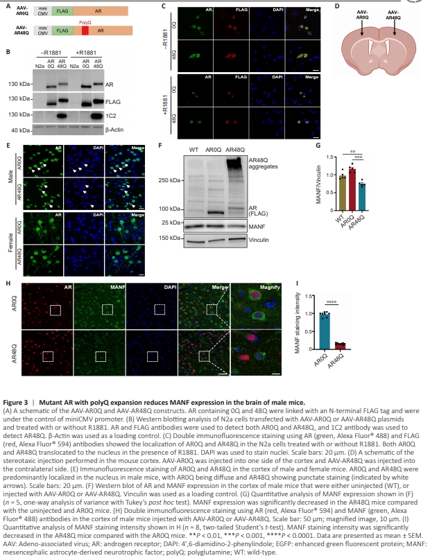 We next wanted to expand our observation to in vivo conditions, in the mouse brain. We constructed AAVAR0Q and AAV-AR48Q with a FLAG tag under the control of the miniCMV promoter (Figure 3A). The plasmids were transfected into the N2a cells, and the expression of AR0Q and AR48Q was confirmed by western blotting using AR, FLAG and 1C2 antibodies (Figure 3B). Immunofluorescence staining also confirmed that both AR0Q and AR48Q translocated to the nucleus upon R1881 treatment (Figure 3C), indicating that these AAV plasmids functioned similar to the original pEGFP-C1 plasmids. These AAV plasmids were packaged into viruses. We then performed stereotaxic surgery to deliver AAV-AR0Q to one side of the cortex and AAV-AR48Q to the contralateral cortex in 2-month-old WT mice (Figure 3D). The mice were sacrificed 1 month after viral injection. We performed immunofluorescence staining to examine the subcellular localization of AR in the brains of the injected mice. In female mice, because of their low androgen levels, both AR0Q and AR48Q were diffuse in the nucleus and cytoplasm of neurons. In the neurons of male mice, because of the presence of abundant androgen, both AR0Q and AR48Q were predominantly located in the nucleus. More importantly, in the male mice, AR48Q, but not AR0Q, formed aggregates in the nucleus, as evidenced by the uneven fluorescent staining patterns (Figure 3E). Therefore, to model the pathogenic environment of SBMA, we used male mice for the subsequent analyses. Western blotting confirmedthe expression of AAV-AR0Q and AAV-AR48Q in the brains of the injected mice. Notably, the aggregated forms of AR48Q were found in the stacking gel, which was consistent with the immunofluorescence staining results. We found that MANF expression was significantly decreased in the AAV-AR48Q mice compared with that in the uninjected mice or the AAVAR0Q mice (Figure 3F and G), suggesting that mutant AR impaired MANF expression in the mouse brain. This result was corroborated by immunofluorescence staining because the staining intensity of MANF was significantly decreased in the AR48Q mice compared with the AR0Q mice (Figure 3H and I)