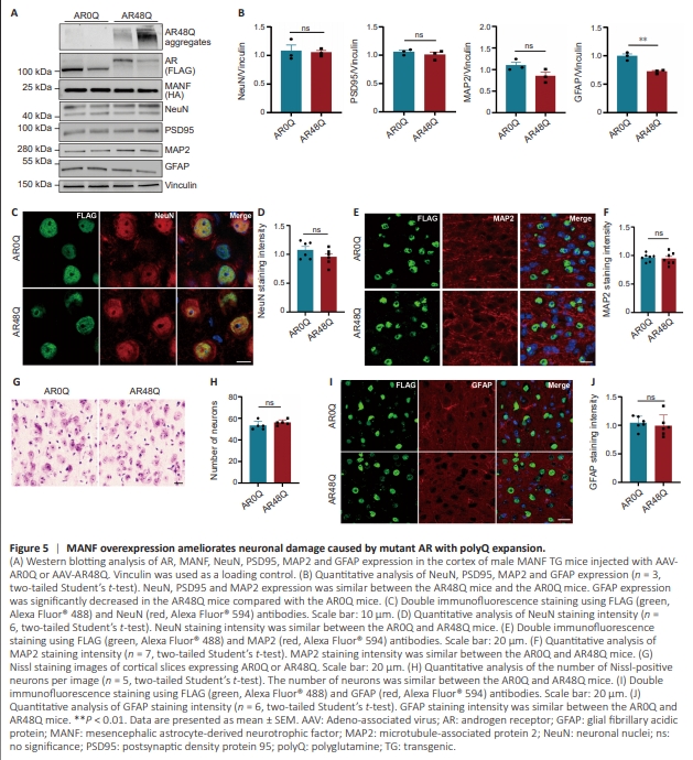 If reduction of MANF expression underlies the neurotoxicity induced by mutant AR, we expected that increasing MANF expression would ameliorate the neuropathology. To investigate this, we used a MANF TG mouse model established in our previous study, in which TG Manf was driven by the prion promoter so that MANF was overexpressed in the brain (Yang et al., 2014). We performed stereotaxic surgery to deliver AAV-AR0Q to one side of the cortex and AAV-AR48Q to the contralateral side in 2-month-old MANF TG mice. These mice were sacrificed 1 month after viral injection. Western blotting analysis showed that the expression of NeuN, PSD95, and MAP2 was similar between the AR0Q and AR48Q mice, whereas GFAP expression was decreased in the AR48Q mice compared with that in the AR0Q mice (Figure 5A and B), indicating that MANF overexpression ameliorated the neurotoxicity of AR48Q. Immunofluorescence staining showed that the NeuN and MAP2 intensities were similar in the AR0Q and AR48Q mice (Figure 5C–F). This result was supported by Nissl staining, which showed no obvious neuronal loss in the cortex of the AR48Q mice (Figure 5G and H). We also performed GFAP staining and found similar levels of reactive astrocytes in the cortex of MANF TG mice expressing AR0Q or AR48Q (Figure 5I and J).