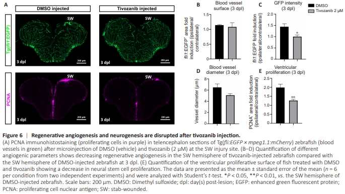 To investigate the impact of angiogenesis on brain regeneration, we microinjected tivozanib at the lesion site. We decided to perform a local microinjection using tivozanib at a concentration of 2 μM at the site of the lesion for several reasons: (i) tivozanib is more potent than vatalanib (total inhibition of developmental angiogenesis at 1 and 5 μM, respectively); (ii) tivozanib is known to inhibit VEGFR1, VEGFR2, and VEGFR3 (Nakamura et al., 2006), whereas vatalanib mainly inhibits VEGFR1 and VEGFR2; and (iii) the injected concentration was doubled compared with treated larvae to compensate for the dilution of the inhibitor following injection. We analyzed angiogenesis and neurogenesis at 3 dpl and injection, considering that both processes were increased at this time point. After an intraparenchymal injection of tivozanib at the lesion site, several parameters of angiogenesis such as the blood vessel diameter and surface tended to decrease, and the GFP transgene intensity that was significantly lower when compared to the vehicle (DMSO)-injected fish (Figure 6A–D).In parallel, we noticed a significant decrease in NSC/progenitor cell proliferation around the ventricular area at 3 dpl (Figure 6A and E). These data showed that inhibition of the VEGF signaling pathway is important for both regenerative angiogenesis and neurogenesis during brain repair. Note that we obtained similar results with the co-injection of tivozanib and vatalanib (1 μM of each), strengthening these findings (data not shown).