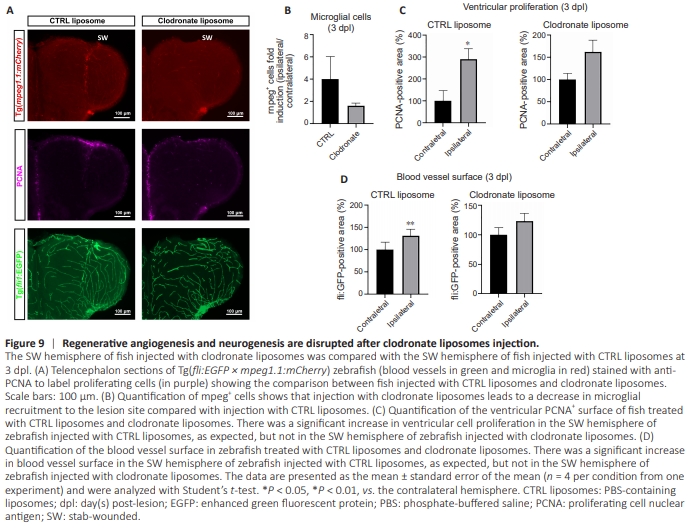 Figure 9 | Regenerative angiogenesis and neurogenesis are disrupted after clodronate liposomes injection.
