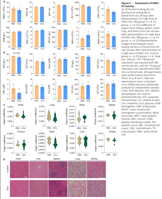To explore the possibility of using hNSC-EVs in a clinicalcontext, we assessed their immunoreactivity and toxicity. First, we evaluated the immunoreactivity associated with intravenous administration of PBS and a high dose (five times the therapeutic dose) of hNSC-EVs in SD rats by evaluating the peripheral blood lymphocyte subtypes of the two groups on days 1 (Figure 5A) and 14 (Figure 5B). Differences in CD3+ CD161+ NKT cell counts were observed between the two groups on day 1, which could have resulted from the xenotransplantation with hNSC-EVs; however, these differences were not present on day 14. Other indicators such as proportions of lymphocytes, T cells, CD4+ T cells, CD8+ T cells, CD4+ CD8+ T cells, CD45RA+ B cells and CD161+ NK cells out of total leukocytes did not change significantly, suggesting that hNSC-EVs were not immunoreactive. Next, we evaluated the potential toxicity associated with intravenous administration of high-dose hNSC-EVs for 28 days in our rat model. Hematological and chemical analyses of the blood (Figure 6A and B) and organ coefficients (Figure 6C), as well as indepth histopathological evaluation of several different tissues (Figure 6D), did not reveal any hNSC-EV treatment-associated abnormalities. Thus, the immunoreactivity and toxicity results indicate that the hNSC-EVs had a good safety profile in vivo.