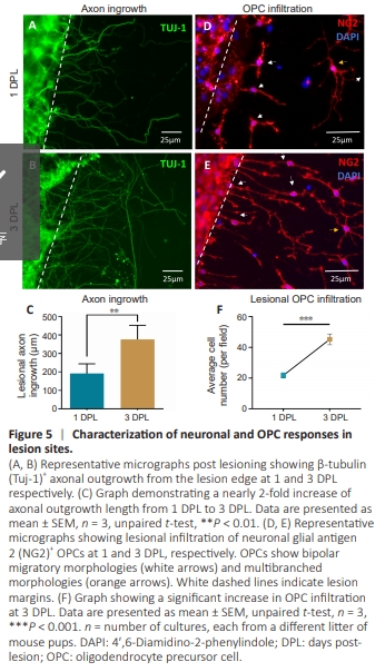 To evaluate axonal injury/regeneration and post-injury OPC infiltration into lesions, as observed in vivo, we performed immunostaining to study axonal/OPC responses. Clear axonal transection with well-defined lesion margins was observed (Figure 5A). Axonal outgrowth from the lesion edges was detected as early as 1 DPL, with an average extension of 211.86 ± 23.37 μm (Figure 5A). By 3 DPL, axonal outgrowth nearly doubled, reaching 394.40 ± 29.34 μm (Figure 5B), a significant increase compared to 1 DPL (P < 0.01; Figure 5C). Concomitantly, intra-lesional NG2+ OPC infiltration increased significantly, more than doubling from 1 DPL to 3 DPL (Figure 5D–F), with cell density rising from 21.8 ± 1.7 cells/mm2 to 45.3 ± 3.5 cells/mm2 (P < 0.001; Figure 5F). Migratory bipolar OPC profiles were evident within the lesion area at both 1 and3 DPL (Figure 5D and E), along with non-migratory multipolar profiles (Figure 5D and E), indicating active OPC migration into the injury site. Notably, there was no evidence of OPC nuclear doublets, suggesting the absence of OPC proliferation within the lesion area.