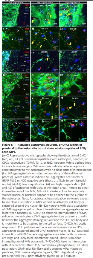 Figure 6 | Activated astrocytes, neurons, or OPCs within or pro0ximal to the lesion site do not show obvious uptake of PEG/ CMX MPs.