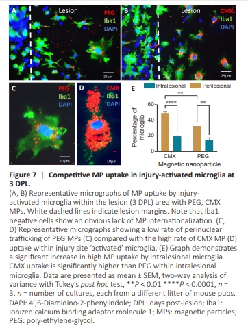 To evaluate the suitability of our injury model for biomaterial testing, including the ability to replicate known cellular responses to MPs, we introduced PEG and CMX MPs immediately post-injury. High MP accumulations in lesions were consistently associated with cells negative for astrocyte, neuron, or OPC markers. Cellular regions in close proximity to MP aggregates showed no clear signs of internalization (i.e., the MP aggregate falls outside the boundary of the cell body/process), therefore these aggregates are more likelyo be membrane-bound rather than internalized (Figure 6). Note there are also MP aggregates that are non-specifically bound to the coverslips. MPs showed clear co-localisation to the nuclei of infiltrating microglia (Figure 7A and B). At 3 DPL, injury-activated microglia demonstrated greater uptake of CMX versus PEG MPs with evidence of peri-nuclear MP trafficking (Figure 7C–E). In addition, intralesional microglia demonstrated significantly greater levels of MP uptake versus peri-lesional microglia (P < 0.001; Figure 7E).