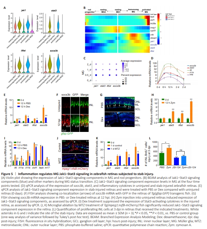 t has been demonstrated that Jak-Stat signaling is required for MG reprogramming and proliferation (Zhao et al., 2014). However, the connection between this signaling pathway in MG and inflammation remains unclear. We first examined the expression of Jak1–Stat3 signaling components in different MG subtypes and rod progenitor cells using our scRNAseq data. Our analysis showed that genes encoding key components of the Jak1–Stat3 signaling pathway, including jak1, stat3, il6st (GP130), and the downstream reporter socs3b, were enriched in immunoregulatory MG and activated MG, but not in resting MG1/MG2 or in rod progenitor cells(Figure 5A). Pseudotime analysis further demonstrated that expression of the genes encoding Jak1–Stat3 signaling components increased significantly during the transition from resting MG1 to activated MG, but decreased in the rod progenitor cell direction (Figure 5A and B). MG expression of genes encoding Jak1–Stat3 signaling components peaked at 12 hpi (Figure 5C, 0.5 days), coinciding with peak expression of typical inflammatory cytokines in the injured retina, as determined by qPCR (Figure 5D). Further examination of genes encoding Stat3-activating cytokines in the retina revealed that many of them, such as IL-4, IL-6, IL-11β, IL-21, and LIF (m17), were expressed by immune cells (Additional Figure 6A). Importantly, MG expressed genes encoding the corresponding receptors for some of these Stat3-activating cytokines (Additional Figure 6B and C). These findings suggest that secretation of Stat3-activating cytokines by immune cells could activate Jak1–Stat3 signaling in MG, thereby regulating MG reprogramming and proliferation. To investigate whether inflammation is required for activation of Jak1–Stat3 signaling in MG, zebrafish were treated with Dex or intravitreally injected with Zym to suppress or enhance retinal inflammation, respectively (Zhang et al., 2020; Zhou et al., 2022). qPCR analysis showed that Dex treatment significantly reduced the expression of genes encoding Jak1–Stat3 signaling component in the injured retina (Figure 5E). This was further confirmed by fluorescence in situ hybridization, which demonstrated that expressionof the Jak1–Stat3 reporter socs3b was increased in MG at 12 hpi (Figure 5F), while Dex treatment nearly abolished the socs3b signal in the inner nuclear layer (Figure 5G). Conversely, intravitreal injection of Zym into the uninjured retina led to a significant increase in retinal expression of Jak1–Stat3 signaling components (Figure 5H), suggesting that inflammation alone was sufficient to activate this signaling pathway in the intact retina. Furthermore, Dex treatment markedly reduced the injury-dependent expression of IL-6– family cytokines in the retina (Figure 5I), providing further support for the role of inflammation in regulating Jak1–Stat3 signaling in MG. Consistent with this, microglial ablation in Tg(mpeg1:nfsB-mcherry) transgenic fish (Zhang et al., 2020) significantly decreased the expression of Jak1–Stat3 signaling components in the injured retina (Figure 5J and K), indicating that microglia are necessary for activation of this signaling. We previously demonstrated that enhancing retinal inflammation via Zym injection promotes MG proliferation in the injured retina (Zhang et al., 2020; Zhou et al., 2022). Importantly, this effect was abolished in the retinas of fish treated with a Stat3 inhibitor JSI-124 (Figure 5L), suggesting that inflammation regulates MG proliferation through Jak1–Stat3 signaling.