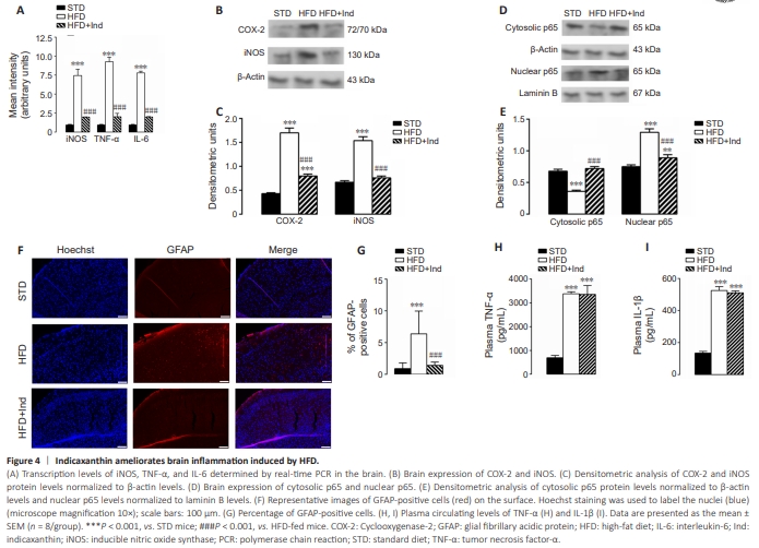 Oxidative stress and inflammation are mutually linked and are closely associated with neurodegeneration (Kempuraj et al., 2016). Consequently, we evaluated whether and how Ind treatment could alleviate HFD-induced neuroinflammation. Molecular analyses of proinflammatory parameters revealed that the gene upregulation of iNOS, TNF-α, and IL-6 observed in HFD-fed brains was significantly decreased in HFD + Ind-fed brains (P < 0.001), as was the protein overexpression of iNOS and cyclooxygenase-2 (COX-2) (P < 0.001; Figure 4A?C). Moreover, the nuclear translocation of NF-kB, a key transcription factor involved in the elaboration of proinflammatory mediators, was increased in HFD-fed brains. Notably, these effects were mitigated by Ind treatment (Figure 4D and E).Furthermore, to confirm the anti-inflammatory activity of Ind in the brain, the presence of GFAP, an index of astrocyte activation and gliosis in the brain, was evaluated in brain sections from different animal groups via immunofluorescence. The analysis revealed increased GFAP immunoreactivity in the superficial cerebral cortex of HFD-fed animals compared with that in STD-fed animals (P < 0.001). This increase was not observed in HFD + Ind mice. In fact, the number of GFAP-positive cells in the cerebral sections from HFD + Ind mice was similar to that in the STD-mice (Figure 4F and G). However, the plasma concentrations of the inflammatory cytokines TNF-α and IL-1β, which were significantly greater in HFD-fed mice than in STD-fed mice (P < 0.001), were not significantly modified by Ind treatment (Figure 4H and I). These results suggest that Ind is able to mitigate HFD-induced neuroinflammation.