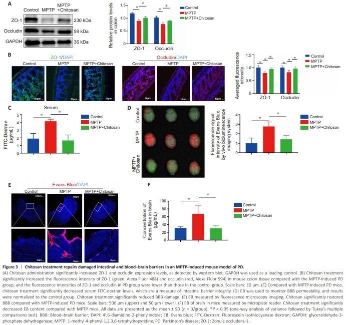 Figure 3 | Chitosan treatment repairs damaged intestinal and blood–brain barriers in an MPTP-induced mouse model of PD.