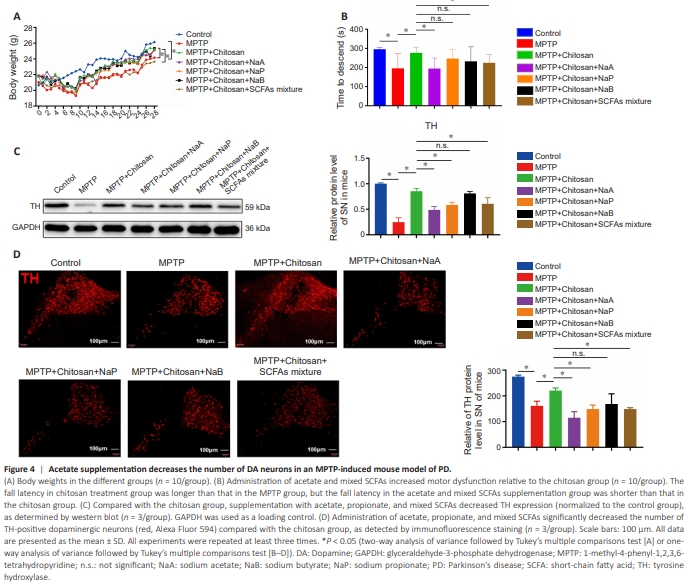 Female mice have a higher death rate and experience more side effects than male mice following MPTP exposure (Jackson-Lewis and Przedborski, 2007), so only male mice were used in this study. Male C57BL/6J mice (18–22 g, 8 weeks old) were obtained from the Animal Center, Kunming Medical University, China (license No. SCXK (Dian) K2020-0004). The Animal Ethics Committee of Kunming Medical University approved the study (approval No. kmmu20220443; approval date: February 21, 2022). All experiments were designed and reported according to Animal Research: Reporting of In Vivo Experiments (ARRIVE) guidelines (Percie du Sert et al., 2020). All mice were housed in a controlled, specific pathogen-free environment (temperature, 23 ± 3°C; humidity, 55% ± 15%, 12/12-hour light/dark cycle) with free access to food and water. Body weights were recorded daily. As shown in Figure 1A, the mice were randomly divided into seven groups: (1) the control group (n = 26), which received 125 μL normal saline via intraperitoneal injection once daily for 5 days; (2) the MPTP group (PD model group) (n = 26), which treated with MPTP-HCl (Sigma, St. Louis, MO, USA, M0896, 30 mg/kg) via intraperitoneal injection once daily for 5 days, followed by intragastric administration of 200 μL of 0.5% acetic acid (Tianjin Zhiyuan Chemical Reagent Co., Ltd., China) once daily for 26 days; (3) the MPTP + chitosan group (chitosan group) (n = 32), which was treated with same dosage of MPTP-HCl via intraperitoneal injection for 5 days, followed by intragastric administration of 200 μL of 0.5% chitosan (5 mg/mL, TCI, Tokyo, Japan, C0831) in 0.5% acetic acid once daily for 26 days; (4) the MPTP + chitosan + acetate [NaA]/butyrate [NaB]/propionate [NaP]/ short-chain fatty acid [SCFAs] mixture group (NaA/NaB/NaP/SCFAs group) (n = 10 per group), which received the same treatment as the chitosan group, followed by oral administration of 67.5 mM sodium acetate (Sigma, S2889), 25 mM sodium propionate (Sigma, P1880), 40 mM sodium butyrate (Sigma, 303410), or a mixture of SCFAs (67.5 mM acetate, 40 mM butyrate, 25 mM propionate) for 28 days); (5) the control + NaA group (n = 4), which received the same treatment as the control group, followed by oral administration of 67.5 mM sodium acetate for 28 days; (6) the MPTP + NaA group (n = 4), which received the same treatment as MPTP group, followed by oral administration of 67.5 mM sodium acetate for 28 days; and (7) the peroxisome proliferatoractivated receptor delta (PPARD) treatment group (n = 6), which received the same treatment as the chitosan group, followed by intragastric administration of 3 mg/kg GSK0660 (Selleck, Houston, TX, USA, S5817) for 28 days. Cell culture and drug treatments The human epithelial cell line Caco-2 was obtained from and identified by Kunming Institute of Zoology (Strok No. KCB200710YJ). The Caco-2 cell has been extensively used as a specialized model of intestinal epithelial cells in vitro, and accordingly, we selected it to investigate the role of acetate. The cells were maintained in Dulbecco’s modified Eagle medium (Gibco, Suzhou, China, C11995500BT) supplemented with 10% fetal bovine serum (Gibco) and 1% penicillin/streptomycin (Gibco), and incubated under standard cell culture conditions (37°C, 5% CO2). When the cells reached approximately 60%–70% confluency, they were treated with 500 μM sodium acetate, 20 μM of the PPARD agonist GW0742 (Selleck, S8020), 500 μM sodium acetate + 20 μM GW0742, 2 mM of the adenosine 5′-monophosphate-activated protein kinase (AMPK) agonist AICAR (MCE, Monmouth Junction, NJ, USA, HY-13417), or 500 μM sodium acetate + 2 mM AICAR. The Caco-2 cells were cultured for another 24 hours after drug treatment (Figure 1B) Chitosan has neuroprotective effects in Drosophila melanogaster and PD cell models (Bhattamisra et al., 2020; Pramod Kumar and Harish Prashanth, 2020; Nehal et al., 2021; Sardoiwala et al., 2021); however, the mechanism by which chitosan exerts its neuroprotective effects in PD has not been elucidated, because it is indigestible in vivo (Gallaher et al., 2000; Yao and Chiang, 2006). As shown in Figure 1C, the average body weight was significantly lower in MPTP group than in the control group (P < 0.0001). By contrast, the average body weight in the chitosan treatment group was higher than that in the PD model group. Notably, mice exposed to MPTP exhibited motor dysfunction, while those that received oral administration of chitosan exhibited fewer symptoms (Figure 1D). DA neuron loss in the SN is the primary pathological characteristic of PD. TH is the rate-limiting enzyme in DA synthesis and a specific marker of DA neurons (Roy, 2017). We found that TH protein levels were significantly lower in MPTP-induced PD mice than in control mice (P < 0.0001); however, TH protein levels were partly restored in the chitosan treatment group (P = 0.0042; Figure 1E). Similarly, compared with the control group, there were fewer TH-positive cells in the SN in the MPTP model group; however, the animals treated with chitosan showed increased TH-positive cells by immunofluorescence staining (Figure 1F). The death of DA neurons is accompanied by changes in the levels of DA and its primary metabolites, including 3,4-dihydroxyphenylacetic acid (DOPAC) and homovanillic acid (HVA), in the striatum (Yao et al., 2020). The DA content in the striatum of MPTP-induced PD mice was significantly lower than in control mice (P = 0.0002), and the DA content in the chitosan group was significantly higher than that in MPTP-induced PD mice (P = 0.0046; Figure 1G). Nevertheless, there was no significant difference in HVA and DOPAC levels among the three groups. The elevated DOPAC level and HVA/DA ratio in the striatum might be a compensatory mechanism for reduced DA neuron numbers and DA levels, as observed in patients with PD and in PD models (Pifl and Hornykiewicz, 2006). We calculated the DOPAC/DA, HVA/DA, and DOPAC + HVA/DA ratios as a pr