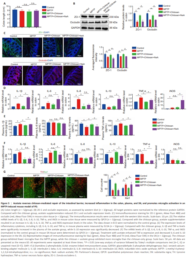 SCFAs interact locally with intestinal epithelial cells to mediate intestinal mucosal immunity and barrier function (Dalile et al., 2019). As described above, we found that chitosan treatment restored intestinal barrier integrity (Figure 4). Colon length is a marker for evaluating the severity of colonic inflammation (Tanaka et al., 2003). We observed no significant difference in colon length among the groups including the control, MPTP, chitosan and chitosan + NaA groups (Figure 5A). ZO-1 and occludin protein levels were elevated in the chitosan group than MPTP group; however, acetate supplementation was associated with a decreasing trend in the expression of these two proteins (Figure 5B). Likewise, immunofluorescence analysis of colon sections showed that ZO-1 and occludin expression levels were lower in the acetate group than in the chitosan group (Figure 5C). These findings suggest that acetate suppresses ZO-1 and occludin expression, thereby damaging the mouse intestinal barrier. It remains unclear how disruption of the intestinal barrier aggravates PD. Talley et al. (2021) reported that local inflammation in the colon drives systemic inflammation and neuroinflammation through the gut–brain signaling axis, potentially mediated by the gut microbiota; alternatively, inflammation in the intestine could lead to systemic inflammation and subsequently activate CNS inflammation. To explore the effect of acetate supplementation on inflammation following chitosan treatment, we measured changes in inflammatory factors in the colon, plasma, and SN. Levels of the pro-inflammatory factors IL-1β, IL-6, IL-8, TNF-α, and iNOS were elevated in the colon in MPTP group compared with the control group. The expression level of the anti-inflammatory cytokine IL-10 in the colon was lower in MPTP mice than in control mice (Figure 5D). Compared with the MPTP group, mice treated with chitosan showed lower IL-1β, IL-8, and TNF-α expression levels in the colon, but no significant changes in IL-6, IL-10, or iNOS expression levels (Figure 5D). However, acetate supplementation increased IL-1β, IL-6, TNF-α, and iNOS expression in the colon (Figure 5D). SCFAs affect systemic inflammation by regulating interleukin secretion (Dalile et al., 2019). Mice in the MPTP group exhibited higher plasma IL-1β and TNF-α levels than control mice (Figure 5E), while chitosan treatment significantly reduced IL-1β (P = 0.0128) and TNF-α (P = 0.0003) levels and increased IL-10 (P = 0.0002) levelsin mouse plasma compared with the MPTP group (Figure 5E). By contrast, IL1β (P = 0.0014) and TNF-α (P = 0.0095) levels were significantly increased, and plasma IL-10 (P = 0.0162) levels were decreased, by acetate treatment (Figure 5E). There was no difference in plasma IL-6 levels among all groups (Figure 5E). Next, we sought to determine whether increased inflammatory responses occurred in the CNS following acetate administration. We found that IL-1β and IL-6 levels were elevated, while IL-8, IL-10, and iNOS (not TNF-α) levels were reduced, in the SN of mice in the MPTP group compared with control mice (Figure 5F). Chitosan treatment downregulated IL-1β and TNF-α and upregulated IL-10 in the SN compared with the MPTP group (Figure 5F). Acetate supplementation elevated TNF-α expression and reduced IL-6 and IL-10 expression in the SN compared with the chitosan group (Figure 5F). There no significant differences in IL-1β, IL-6, or TNF-α expression levels in cerebrospinal fluid among the groups (Additional Figure 2F). The presence of pro-inflammatory cytokines in the colon, plasma, and SN in MPTP-induced PD mice suggests that systemic inflammation includes neuroinflammation. Microglia are the primary resident innate immune cells of the CNS, and activated microglia secrete pro- and anti-inflammatory cytokines that contribute to neuroinflammation (Voet et al., 2019). Immunofluorescence staining for Iba1, a marker of activated microglia, showed that there were more Iba1-positive cells in the SN in the MPTP group than in the control group, and that chitosan treatment induced a marked decrease (Figure 5G). Acetate amplified the number of Iba1-positive cells (Figure 5G). These findings suggest that, in MPTP-induced PD mice treated with chitosan, acetate supplementation inhibits the expression of tight junction proteins, thereby impairing the integrity of the intestinal barrier, increasing systemic inflammation, and ultimately triggering CNS inflammation, especially in the SN.