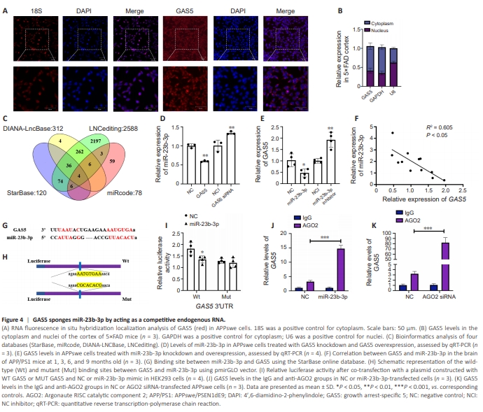 Before exploring GAS5 pathogenesis in AD, the distribution of GAS5 within different subcellular regions was examined. FISH experiments showed that GAS5 shuttled between the cytoplasm and nucleus in APPswe cells (Figure 4A), and was primarily localized in the cytoplasm in the cortex of 5×FAD mice (Figure 4B), indicating that GAS5 is a largely cytoplasmic lncRNA. Cytoplasmic lncRNAs have been shown to bind to miRNAs, lose their ability to interact with target mRNAs, and act as ceRNAs or sponges (Cao et al., 2018; Tang et al., 2020). Subsequent bioinformatics analyses of four databases (StarBase, miRcode, DIANA-LncBase, and LNCediting) showed GAS5 binding to four intersected miRNAs (Figure 4C). Of these, miR-23b-3p and miR-1297 showed better species conservation in primates and mammals (Additional Table 2). However, miR-1297 expression was not regulated by GAS5 overexpression or knockdown (Additional Figure 4). In previous studies, we identified that miR23b-3p was dysregulated and suppressed tau phosphorylation via specific binding to GSK-3β 3′-UTR (Jiang et al., 2022). Thus, we assessed the miR-23b3p level, which was significantly decreased when GAS5 was overexpressed (P < 0.01 vs. NC; Figure 4D), and increased when GAS5 was silenced (P < 0.01 vs. NCI; Figure 4D). The GAS5 level was significantly decreased or increased byup- or down-regulating miR-23b-3p, respectively (both P < 0.05 vs. NC/NCI; Figure 4E). Furthermore, miR-23b-3p was negatively correlated with GAS5 expression in APP/PS1 mice (R2 = 0.605, P < 0.05; Figure 4F). The Starbase database indicated putative binding sites of GAS5 and miR-23b3p (Figure 4G). To validate the relationship, a dual-luciferase reporter system was established using a cloning sequence of the binding site or its mutation into a luciferase vector (Figure 4H). miR-23b-3p inhibited luciferase activity in Luc-GAS5-Wt-transfected cells compared with cells co-transfected with NC (P < 0.05 vs. NC; Figure 4I). Furthermore, the GAS5 mutation sequence did not influence luciferase activity, suggesting a direct interaction of GAS5 with miR23b-3p. AGO2 serves as a critical regulator of miRNA silencing function, and therefore an anti-AGO2 RIP assay was performed. Endogenous GAS5 pull-down by AGO2 was significantly increased in miR-23b-3p-transfected APPswe cells (P < 0.001 vs. NC; Figure 4J). In contrast, AGO2 silencing attenuated AGO2- dependent degradation of GAS5 and increased the GAS5 level (P < 0.001 vs. NC; Figure 4K), implying that miR-23b-3p bound to GAS5 and mediated its degradation. These results support that GAS5 directly targeted miR-23b-3p and regulated its expression.