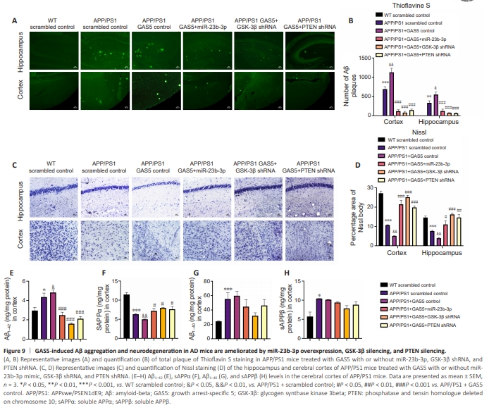 Figure 9 | GAS5-induced Aβ aggregation and neurodegeneration in AD mice are ameliorated by miR-23b-3p overexpression, GSK-3β silencing, and PTEN silencing.