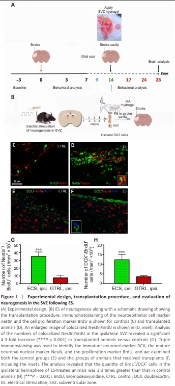 The experimental setup is illustrated in Figure 1A (top panel), while Figure 1B presents a schematic representation of the transplantation process. For the first 3 days after stroke, the animals in all the groups were fed soft pellets to facilitate nutrition. Thereafter, they were allowed to eat ad libitum. The mortality rate was nearly identical, at 8% for each group. All the animals that died did so within the first 7 days after stroke. In the figures showing poststroke behavioral recovery, we have provided the number of animals that survived the 28-day testing period. Electrical stimulation leads to increased neurogenesis in the subventricular zone To assess whether ES led to an increased number of newborn cells in the SVZ, we performed double immunostaining with the neuroepithelial cell marker nestin and the cell proliferation marker BrdU (Balseanu et al., 2020) in both control (Figure 1C) and transplanted animals (Figure 1D, and inset). Analysis of the number of colocalized Nestin/BrdU in the ipsilateral SVZ revealed a significant 4.3-fold increase (P = 0.001) in transplanted animals compared with controls (Figure 1G). By performing triple immunostaining to detect the immature neuronal marker DCX, the mature neuronal nuclear marker NeuN, and the proliferation marker BrdU in control (Figure 1E) and transplanted animals (Figure 1F, and inset), we found that the number of BrdU+ /DCX+ cells in the ipsilateral hemisphere of ES animals outnumbered that in control animals by a factor of 3.3 (P = 0.001; Figure 1H).