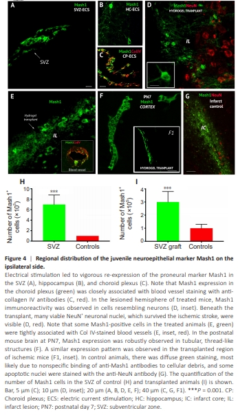 The neuroepithelial marker Mash1 is expressed during brain development but is downregulated in the adult brain (Popa-Wagner et al., 2007). However, ES led to vigorous re-expression of proneural Mash1 in the SVZ (Figure 4A and H), hippocampus (Figure 4B), and choroid plexus (Figure 4C, green). Mash1 expression in the choroid plexus was closely associated with blood vessel staining with anti-collagen IV antibodies (Figure 4C). Mash1 immunostaining in the lesioned hemisphere of treated mice revealed that in the transplanted region, Mash1 immunoreactivity was observed in neuronal-like cells (Figure 4D and I). In the hydrogel containing Mash1+ cells, many NeuN+ neuronal nuclei that survived ischemic stroke were clearly visible (Figure 4D). Like those in the choroid plexus, some Mash1-positive cells (Figure 4E, green) in the treated animals were tightly associated with blood vessels, as visualized with an anti-Col IV antibody (Figure 4E, inset, red). Indeed, in the postnatal mouse brain PN7, Mash1 was robustly expressed in tubular, thread-like structures (Figure 4F). Similar expression was observed in the transplanted region of ischemic mice (Figure 4F1, inset). Finally, in control animals, there was diffuse green staining, most likely resulting from nonspecific binding of anti-Mash1 antibodies to cellular debris caused by tissue necrosis after ischemia, and some apoptotic nuclei were stained with the anti-NeuN antibody (Figure 4G).