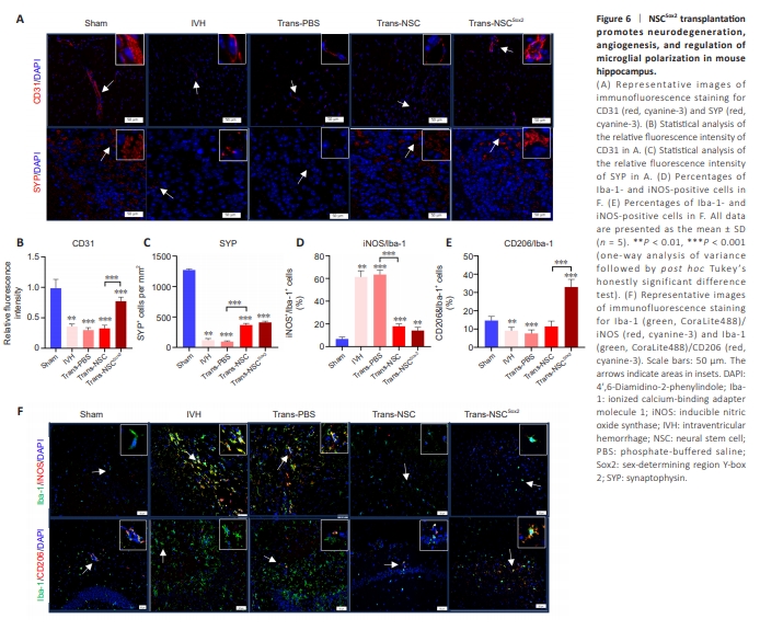 Figure 6 | NSCSox2 transplantation promotes neurodegeneration, angiogenesis, and regulation of microglial polarization in mouse hippocampus.