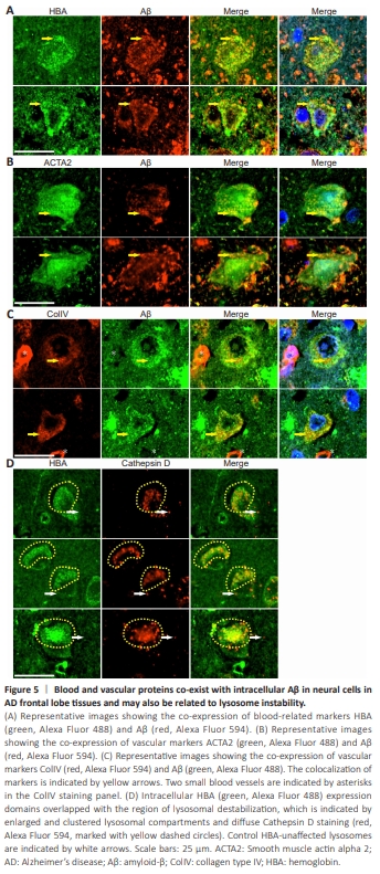 Figure 5 | Blood and vascular proteins co-exist with intracellular Aβ in neural cells in AD frontal lobe tissues and may also be related to lysosome instability.