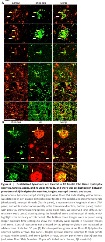 Figure 6 | Destabilized lysosomes are located in AD frontal lobe tissue dystrophic neurites, tangles, axons, and neuropil threads, and there was co-distribution between phos-tau and Aβ in dystrophic neurites, tangles, neuropil threads, and axons.