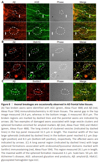 Whether axonal degeneration defects ultimately lead to axonal breakages in AD is a crucial question that needs addressing. We inspected hundreds of images containing Aβ-stained axons. Initially, we focused on axons inside senile plaques traveling in the longitudinal orientation because axons in the transverse orientation were difficult to identify individually. We observed that although many axons passing through the senile plaques were Aβ-positive and enlarged, they did not break (Additional Figure 14). However, we did find a few examples indicating that the axons were broken at locations outside of senile plaques. Using Aβ and AGE antibodies as markers for amyloidosisaffected axons, we were able to detect broken axons with gaps of up to 38.4 μm in width (Figure 8A). What caused these rare axonal breakages is not immediately clear. Additionally, we found that long stretches of amyloidloaded vesicles with large spheroid formations on the axons caused marked dystrophy, to a degree that axon morphology could no longer be recognized (Figure 8B). The long stretch of clustering vesicles with spheroid formations was likely due to lysosome clustering, as indicated by the endosome/ lysosomal marker Sortilin1 (Figure 8C). We speculate that in some cases, the continuous enlargement of destabilized lysosomal compartments across a long distance ultimately results in axonal breakages.