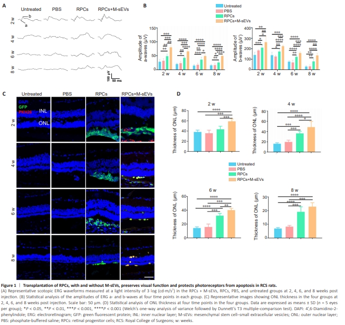 To isolate sEVs, we harvested MSCs from human bone marrow samples (Additional Figure 1B). These MSCs were positively identified by fluorescence-activated cell sorting (FACS) as expressing CD90, CD73, and CD105, while lacking expression of CD34, CD45, and HLA-DR (Additional Figure 1C). Additionally, the MSCs demonstrated multi-lineage differentiation potential, encompassing cartilage, adipogenic, and osteogenic lineages (Additional Figure 1D). The isolation of M-sEVs was achieved using differential centrifugation (Additional Figure 1E). These M-sEVs exhibited a distinctive cup-shaped membrane vesicle structure under transmission electron microscopy (Additional Figure 1F), with a particle size range of 30 to 150 nm as determined by nanoparticle tracking analysis (Additional Figure 1G). Furthermore, the M-sEVs tested positive for the markers CD63, CD9, and HSP70 (Additional Figure 1H). RPCs were also collected (Additional Figure 2A and B) and identified as expressing the neural stem cell markers SOX2, PAX6, and Nestin, while lacking expression of GFAP (Additional Figure 2C–G). To track the grafted cells and sEVs, most (97.2%) of the RPCs were labeled with EGFP via a lentiviral reporter vector (Additional Figure 2H and I), while the M-sEVs were stained with PKH26 dye. To investigate whether M-sEVs can potentiate the therapeutic effects of RPCs in RD model rats, we injected RPCs and M-sEVs (RPCs + M-sEVs) into the subretinal space of RCS rats and conducted scotopic ERG tests at various time points (Figure 1A). Both the RPCs + M-sEVs and RPCs-only groups exhibited increased amplitudes of a- and b-waves compared with the PBS control and untreated groups at 2, 4, 6, and 8 weeks post-injection. Notably, the RPCs + M-sEVs group had significantly higher amplitudes of a- and b-waves than the RPCs group (P < 0.05), particularly at 2 weeks post-transplantation, with this beneficial effect persisting for up to 8 weeks (Figure 1B). Furthermore, our analysis of oscillatory potential waves showed that the amplitudes of these waves were higher in both the RPCs and RPCs + M-sEVs groups compared with the PBS and untreated groups, with the RPCs + M-sEVs group exhibiting significantly higher wave amplitudes than the RPCs group (P < 0.01), at 2 weeks postinjection (Additional Figure 3A and B). These findings suggested that M-sEVs enhance the preservation of inner retinal function. RCS rats reportedly exhibit retinal pigment epithelial cell dysfunction due to mutations in the Mertk gene that lead to photoreceptor cell apoptosisand subsequent decreased thickness of the ONL in the retina (Cuenca et al., 2005). Therefore, we investigated the protective effects of RPCs + M-sEVs on the ONL, which revealed that treatment with either RPCs + M-sEVs or RPCs supported preservation of the ONL thickness compared with PBS or no treatment, across all time points examined. Notably, the ONL in the RPCs + M-sEVs group remained significantly thicker than that in the RPCsonly group (P < 0.05), with this protective effect persisting for up to 6 weeks post-injection (Figure 1C and D). Collectively, these findings suggested that the combined administration of M-sEVs with RPCs significantly enhance the therapeutic effect in the RD model.