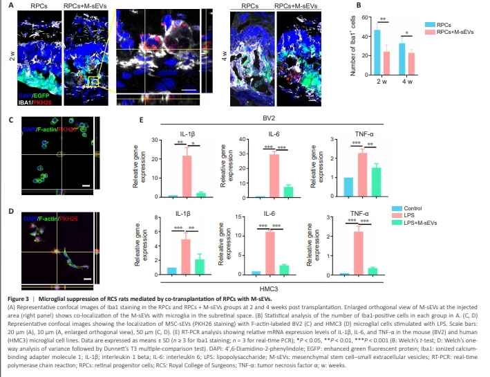Figure 3 | Microglial suppression of RCS rats mediated by co-transplantation of RPCs with M-sEVs.