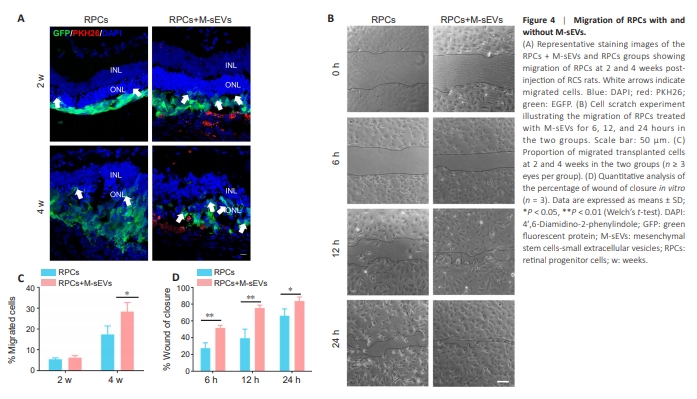 In addition to regulating the microenvironment, we unexpectedly discovered that M-sEVs influenced the distribution and disappearance of grafted RPCs. Post injection, RPCs in the co-transplantation group migrated to the ONL and inner nuclear layer (INL) of the retina at 4 and 6 weeks. Even at 8 weeks, we observed a small number of cells migrating to the retinal ganglion cell layer (GCL) (Figure 4A and Additional Figure 4B). However, quantification of the migrated cells did not reveal a statistically significant difference in the rate of cell migration between the RPCs + M-sEVs and RPCs groups at 2 weeks post injection (Figure 4C). From 4 to 8 weeks post injection, the migration rates in both groups increased, with a higher number of migrated RPCs observed in the cotransplantation group (Figure 4A, C, and Additional Figure 4B and C). These findings suggested that M-sEVs enhance the migration of RPCs in RCS rats. To further investigate this phenomenon, we conducted a scratch wound assay in vitro. The results revealed that the percentage of wound closure was higher in the RPCs + M-sEVs group than in the RPCs-only control group at 6, 12, and 24 hours post scratch (Figure 4B and D). This outperformance by the RPCs + M-sEVs group at each time point demonstrated that M-sEVs effectively promote the migration of RPCs.