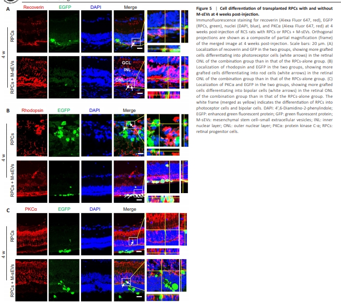 Figure 5 | Cell differentiation of transplanted RPCs with and without M-sEVs at 4 weeks post-injection.
