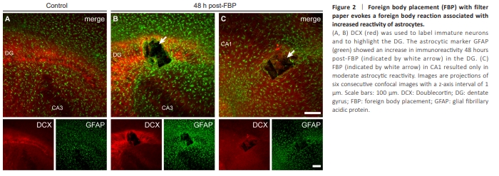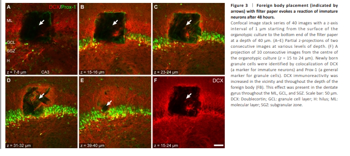 Figure 3 | Foreign body placement (indicated by arrows) with filter paper evokes a reaction of immature neurons after 48 hours.