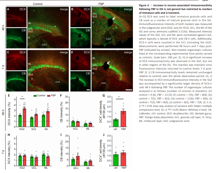 We analyzed DCX, a marker of immature GCs in the DG and CB, a calcium buffering protein that is a marker of mature GCs, to further evaluate whether neuron-associated immunoreactivity was increased overall (Figure 4; Jungenitz et al., 2014). The immunofluorescence intensity of both markers was measured in the SGZ, GCL, and ML of the DG (SGZ was not considered for CB). Additional measurements were performed in CA3, which is typically devoid of DCX- and CB-ir cells and therefore represents unspecific background noise for internal normalization. The identified DCX-ir cells in the GCL (including the SGZ) were counted. Measurements were performed 48 hours (Figure 4A and B) and 7 days (Figure 4C and D) after FBP (indicated by white arrows). Nontreated OTCs served as controls. At this time point (DIV 16), DCX-ir cells in the controls were restricted to a thin layer in the SGZ, with their dendrites reaching the ML, whereas CB-ir cells populated the GCL, and their dendrites were also found in the ML (Figure 4A). At 48 hours after FBP, two-way ANOVA revealed a significant increase in DCX immunoreactivity in the SGZ but not in other regions of the DG (effect of region: P = 0.01; effect of treatment: P = 0.0001; Sidak’s multiple comparisons test: P = 0.003 in the SGZ; Figure 4E). This reaction was transient since the fluorescence intensity returned to control levels at 7 days post-FBP (Figure 4H). CB immunoreactivity levels remained unchanged relative to those of the controls throughout the entire observation period (Figure 4F and I). Counting of DCX-ir cells revealed that the increase in DCX immunofluorescence intensity in the SGZ was accompanied by a significant increase in the density of DCX-ir cells at 48 hours following FBP (Mann?Whitney U test, P = 0.008), which was not sustained at 7 days post-FBP (Figure 4G and J). These results show that the increase in DCX-ir was accompanied by an increase in the number of DCX-positive cells surrounding the FB and that this effect was transient as it was observed at 48 hours but not at 7 days after FBP.
