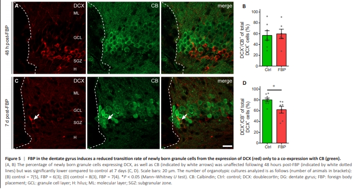 Figure 5 | FBP in the dentate gyrus induces a reduced transition rate of newly born granule cells from the expression of DCX (red) only to a co-expression with CB (green).