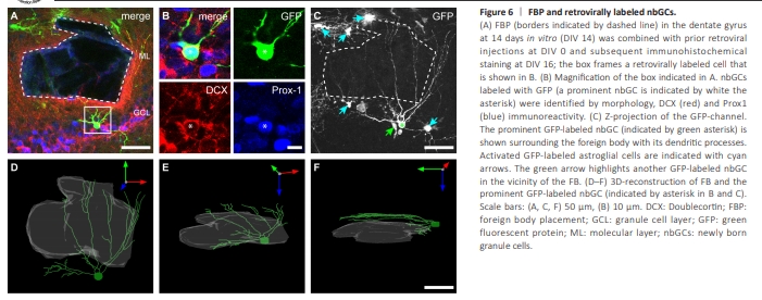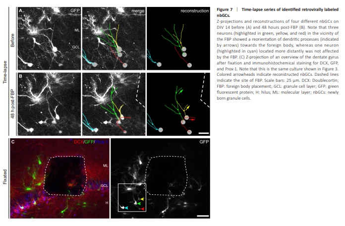 RV labeling enables live imaging of growing and maturing nbGCs in OTCs (Radic et al., 2017b). RV-GFP was locally injected into the DG of OTCs directly after preparation at P4–P5 (DIV 0) to label mitotic cells (van Praag et al., 2002; Radic et al., 2017b) and to further evaluate their potential plastic responses to the FB. Live-imaging of the DG was obtained at DIV 14, and FBP was performed in the suprapyramidal DG directly after imaging. At 48 hours after FBP, GFP-labeled nbGCs in the direct vicinity of the FB exhibited increased growth of dendrites toward the FB (Figure 6). In 13 OTCs, we identified 34 GFP-labeled nbGCs that could be observed directly before and at 48 h after FBP. Seven of 18 successfully GFP-labeled nbGCs located in the direct neighborhood of the FB showed dendritic growth and orientation toward the FB, whereas 16 GFP-labeled nbGCs located at least 150 μm apart from the FB appeared unaffected. Another three GFP-labeled nbGCs located close to the FB exhibited some loss of dendritic branches, probably due to direct physical damage. In addition, GFP-labeled astrocytes presented an increase in processes, including growth toward the FB, which was consistent with the immunohistochemical astroglial activation observed after FBP. Following fixation, the GFP signal was intensified by immunohistochemistry. GFP-labeled nbGCs were identified by morphology and coimmunoreactivity for Prox-1 and DCX (Figure 7). Dendrites of identified nbGCs were frequently observed in close vicinity to FBs, including nbGCs with several dendrites surrounding the FB, as revealed by 3D reconstructions. These results show that as soon as 48 hours after FBP, newly born cells in close vicinity to the FB, but not away from it, display plastic responses involving increased growth of dendrites oriented toward the FB (Figure 7A and B).