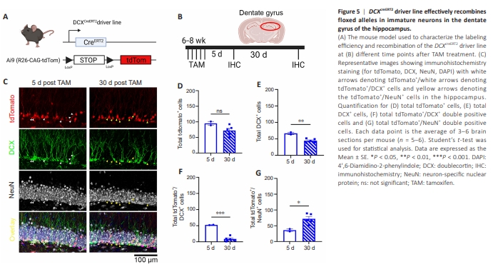 Figure 5| DCXcreERT2 driver line effectively recombines floxed alleles in immature neurons in the dentate gyrus of the hippocampus.