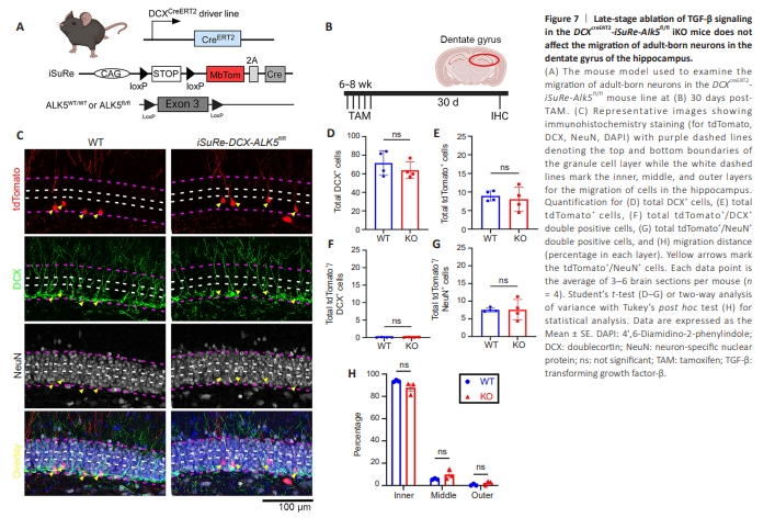 Figure 6 | Late-stage ablation of TGF-β signaling in a DCXcreERT2-ALK5fl/fl-Ai9 iKO mice does not affect the migration of adult-born neurons in the dentate gyrus of the hippocampus.