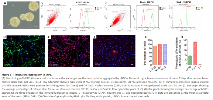 Human fetal NSCs formed clusters of small, round cells that grew into floating spheres (Figure 2A). Flow cytometry analysis of the single cells dissociated from the spheres showed the cells were positive for CD133, nestin, and Sox2 (Figure 2B, C, and G). Immunofluorescence staining that was performed after 10 days of induced differentiation showed that the hNSCs generated cells of all three lineages: astrocytes (GFAP: 34.9% ± 2.1%), neurons (Tuj-1: 89.8% ± 4.6%), and oligodendrocytes (O4: 0.9% ± 0.5%; Figure 2D–F and 2H). Thus, human fetal NSCs showed multilineage differentiation potential in our culture system.