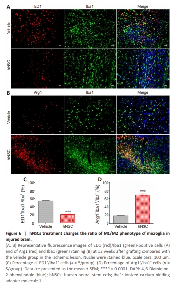 Figure 6 | hNSCs treatment changes the ratio of M1/M2 phenotype of microglia in injured brain.